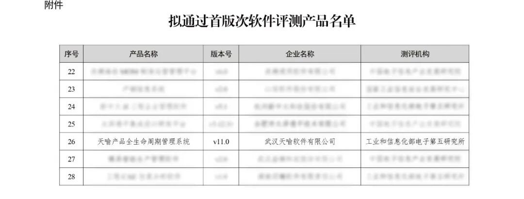 近日,工业和信息化部办公厅《关于开展首版次软件申报工作的通知》(工信厅信发函〔2025〕529号)将拟通过国家级评测的产品名单进行公示,武汉天喻软件有限公司(以下简称天喻软件)IntePLM产品成功入选!