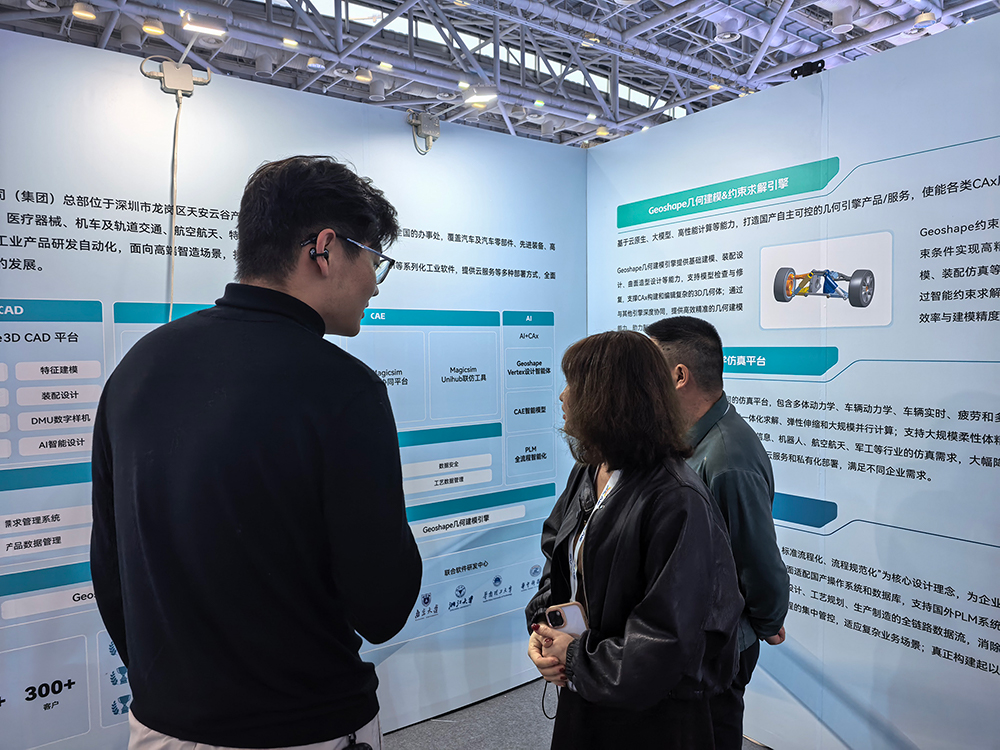展会期间,泊松软件的展台吸引了众多客户驻足。工作人员与到访嘉宾高效洽谈、深入交流,获得了广泛的关注与认可。展台以“高端制造一体化解决方案”为核心,聚焦工业软件核心痛点,通过多元化交互展示与专家团专业讲解,立体呈现 Geoshape几何引擎、Magicsim动力学仿真平台、IntePLM产品全生命周期管理系统等核心产品,让参会者深度感受产品的强大功能与行业适配性。