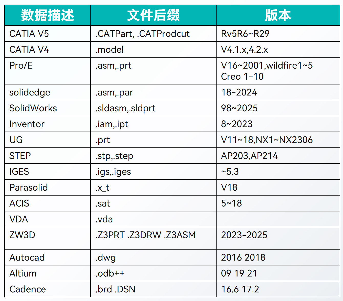 支持超50种主流二维、三维格式,支持常用CAD软件Creo、UG、SolidWorks、CATIA等源数据以及通用二维、三维数据格式的轻量化预览,轻量化比例为1/20~1/50,实现跨系统的数据无缝流转。