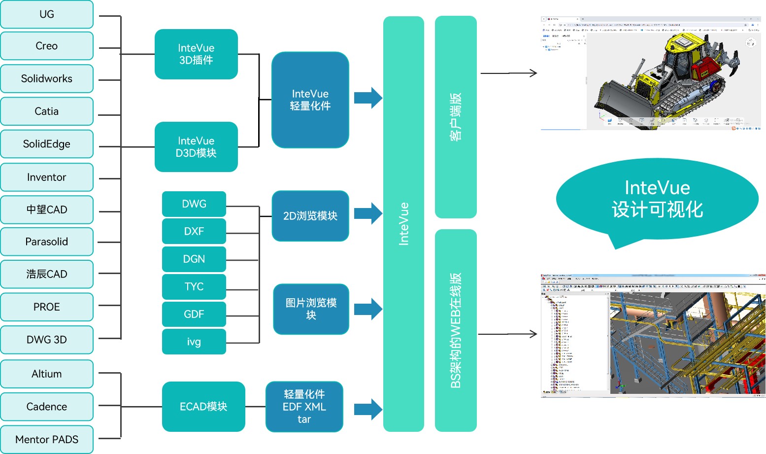 InteVue设计可视化是基于B/S架构的产品,无需安装任何插件,即可在PC、手机、平板等平台实现二/三维图纸的跨平台可视化浏览。该产品支持NX、Creo、CATIA、SolidWorks、Inventor、SolidEdge、AutoCAD、中望、浩辰等主流二维/三维设计软件,Cadence、Altium、Mentor PADS等主流ECAD设计软件,以及主流的二维/三维标准通用数据格式。通过该产品,用户可实现产品二/三维设计模型的可视化浏览和数据提取,并享有精确测量、剖切、爆炸、PMI等基础功能,有效解决了协同设计中多种系统平台、多种终端设备共存带来的异构兼容问题。